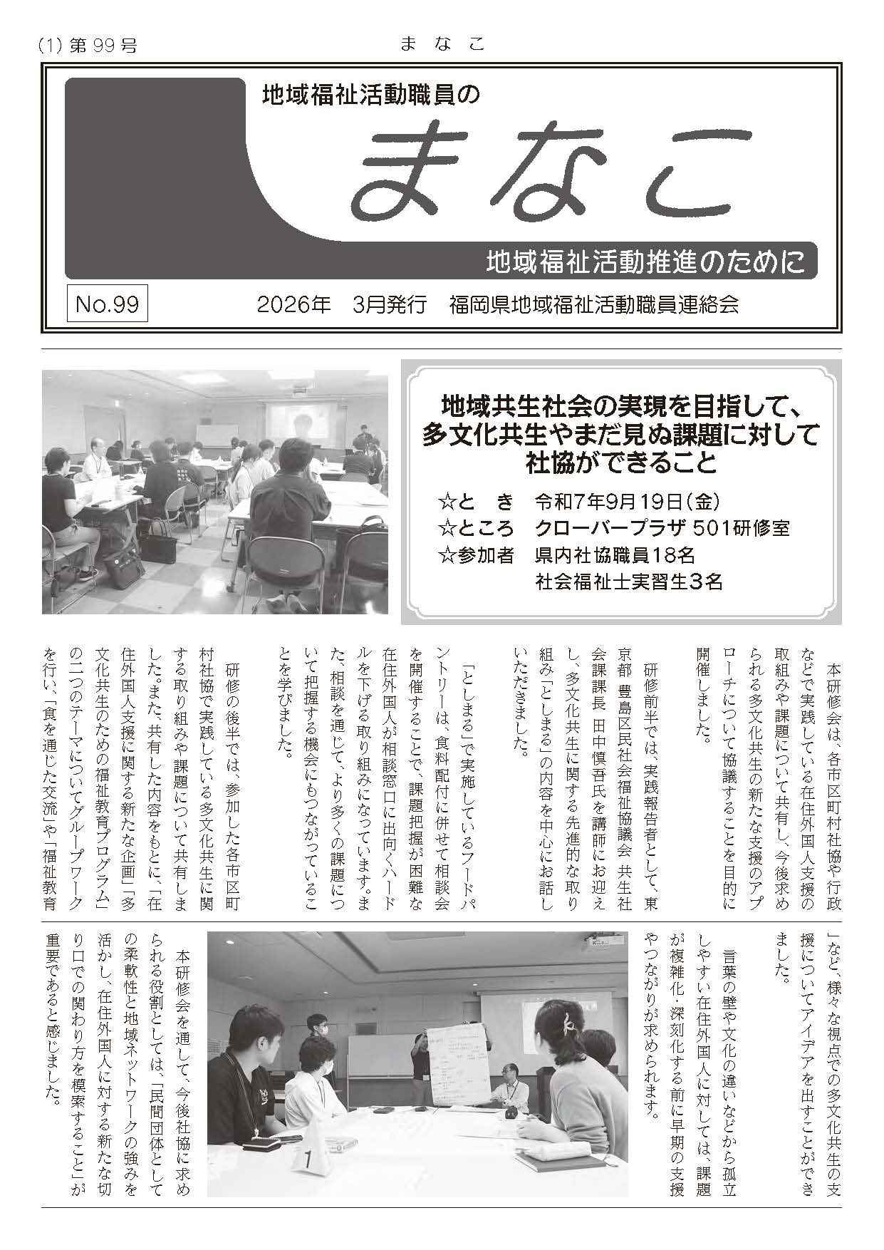まなこ No.99 X Facebook LINE 2026.03.24 2026年(令和8年)3月発行 主な内容 地域共生社会の実現を目指して、多文化共生やまだ見ぬ課題に対して社協ができること ○○らしさを引き出す!社協ワーカースキルアップ研修 伴走型支援について考える研修会~身寄りのない人を地域で支えるためにできることとは!?~ 社協カフェ~悩める社協職員の集い~ 令和8年度総会・研修会のご案内、「まなこ」100号について PDFをダウンロード